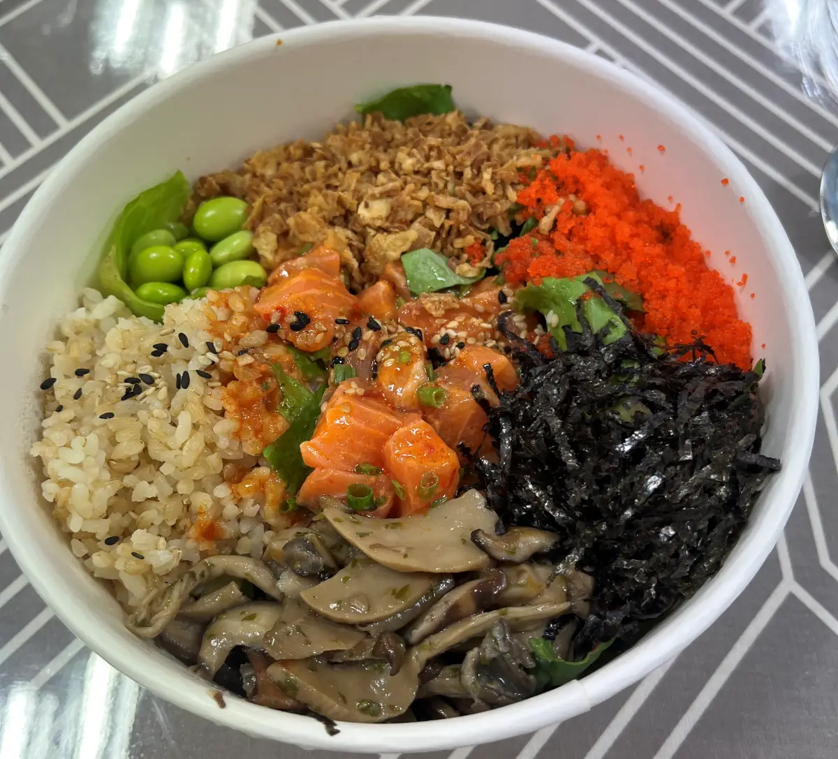 이건 '슬로우캘리'라는 또 다른 포케 체인점의 스파이시연어 포케 + 구운 버섯 추가 조합이네요..