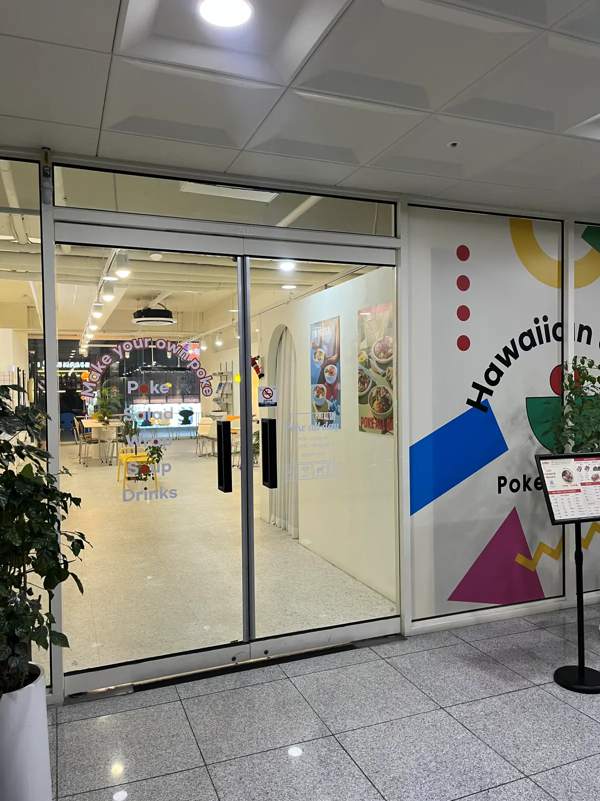 포케올데이 매장을 외부에서 바라봤을 때랑 2층에 올라가면 보이는 입구에요! 특유의 디자인과 간판으로 손쉽게 찾으실 수 있어요. 항상 생각하는 건데 포케올데이 매장은 참 아기자기하니 귀여운 맛이 있어요. ㅎㅎㅎ