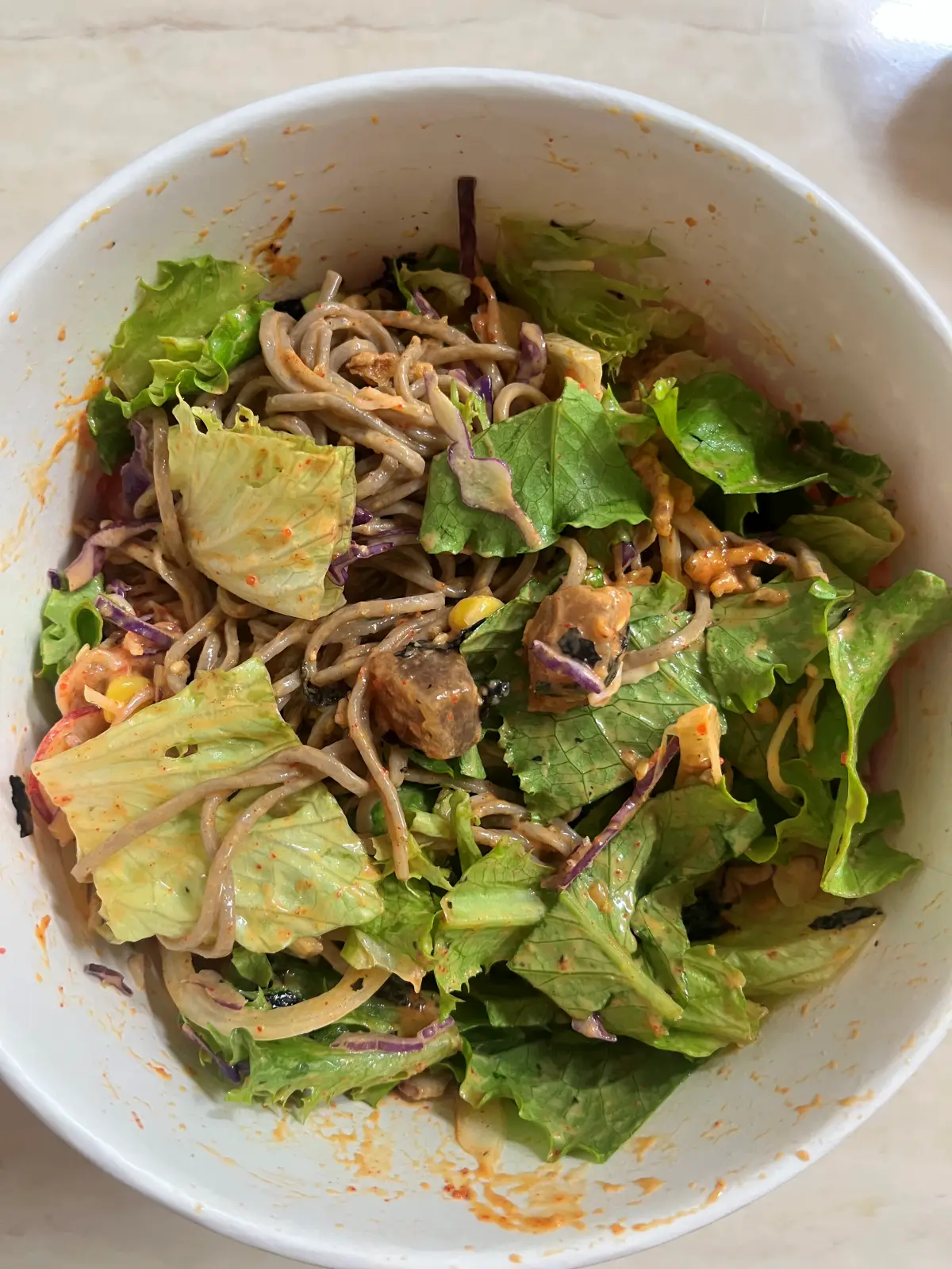 보시다시피 야채도 많이 들어있어요. 그리고 게살, 옥수수, 완두콩, 어니언 후레이크, 김가루 등등 기본 토핑들도 있어요. 야채도 메밀면 아래 더 숨겨져 있답니다. ㅋㅋ 시들시들한 야채 없이 아삭아삭하니 신선해요! 소스 뿌리고 이제 야채에 메밀면, 기본 토핑들, 스파이시 참치 다 섞어서 먹으면 진짜 맛있어요. 야채를 이렇게 맛있게 먹을 수 있다니! 포케 최고!ㅋㅋㅋ 양도 많아서 포만감 장난 아닙니다.