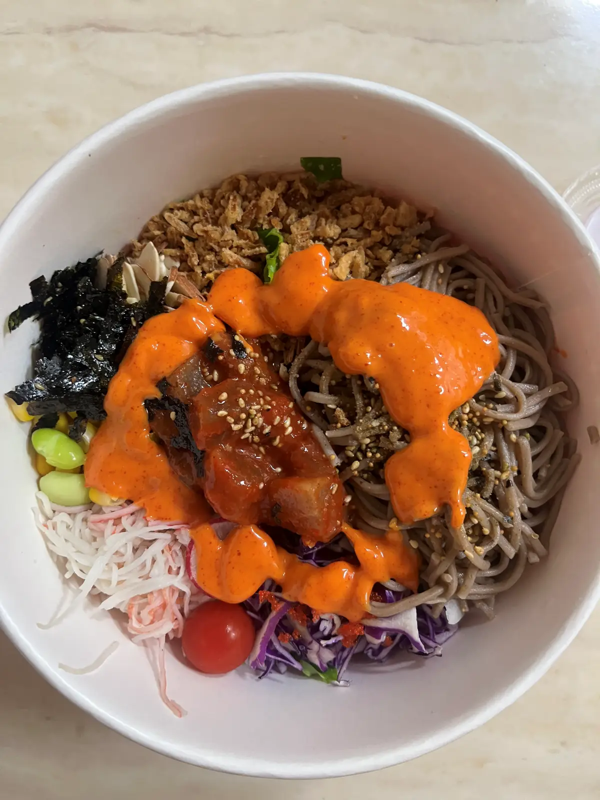 저의 오늘의 포케는 기본 메밀면 베이스에 스파이시참치 토핑 그리고 스리라차 마요 소스로 선택하였습니다!
