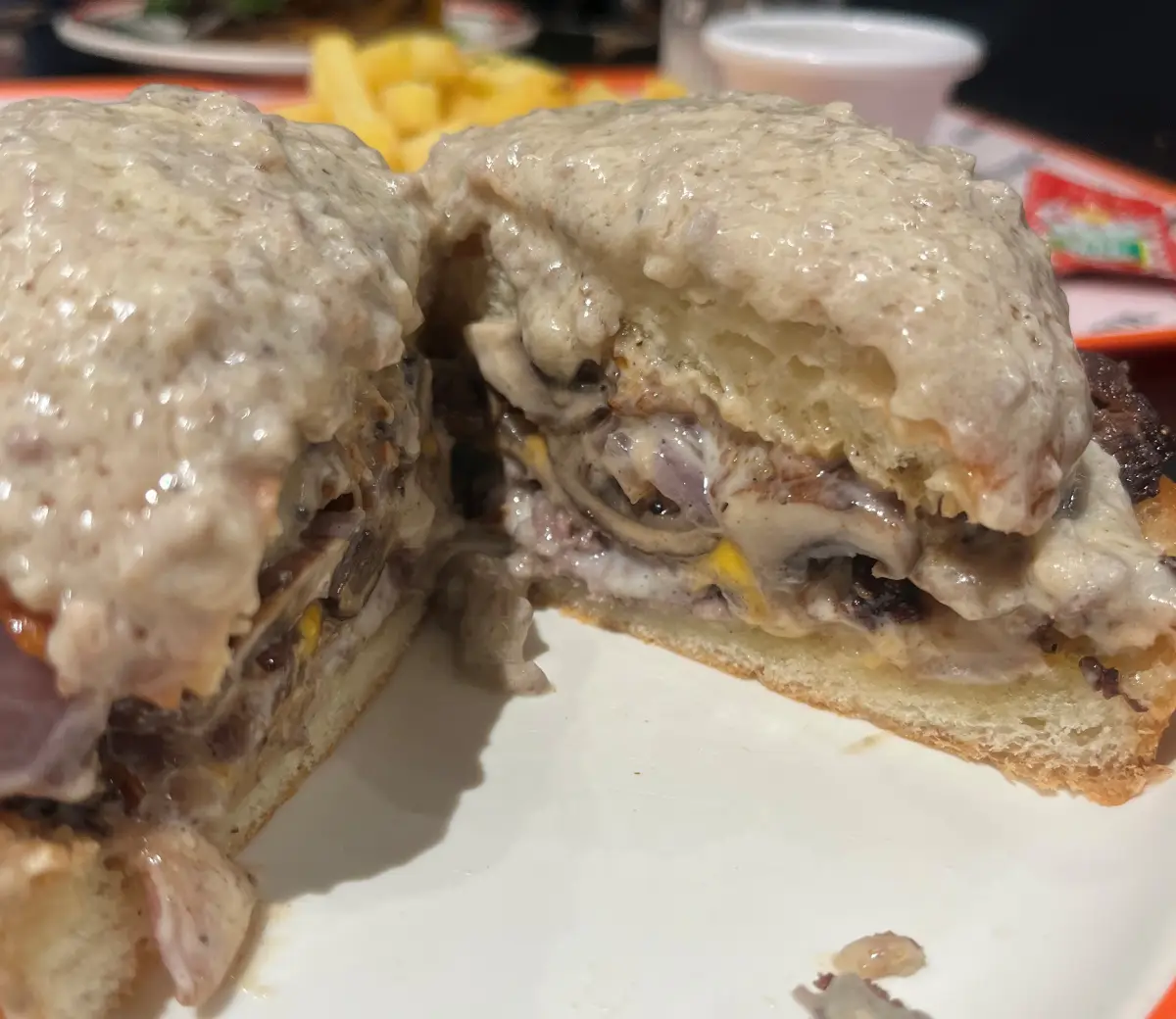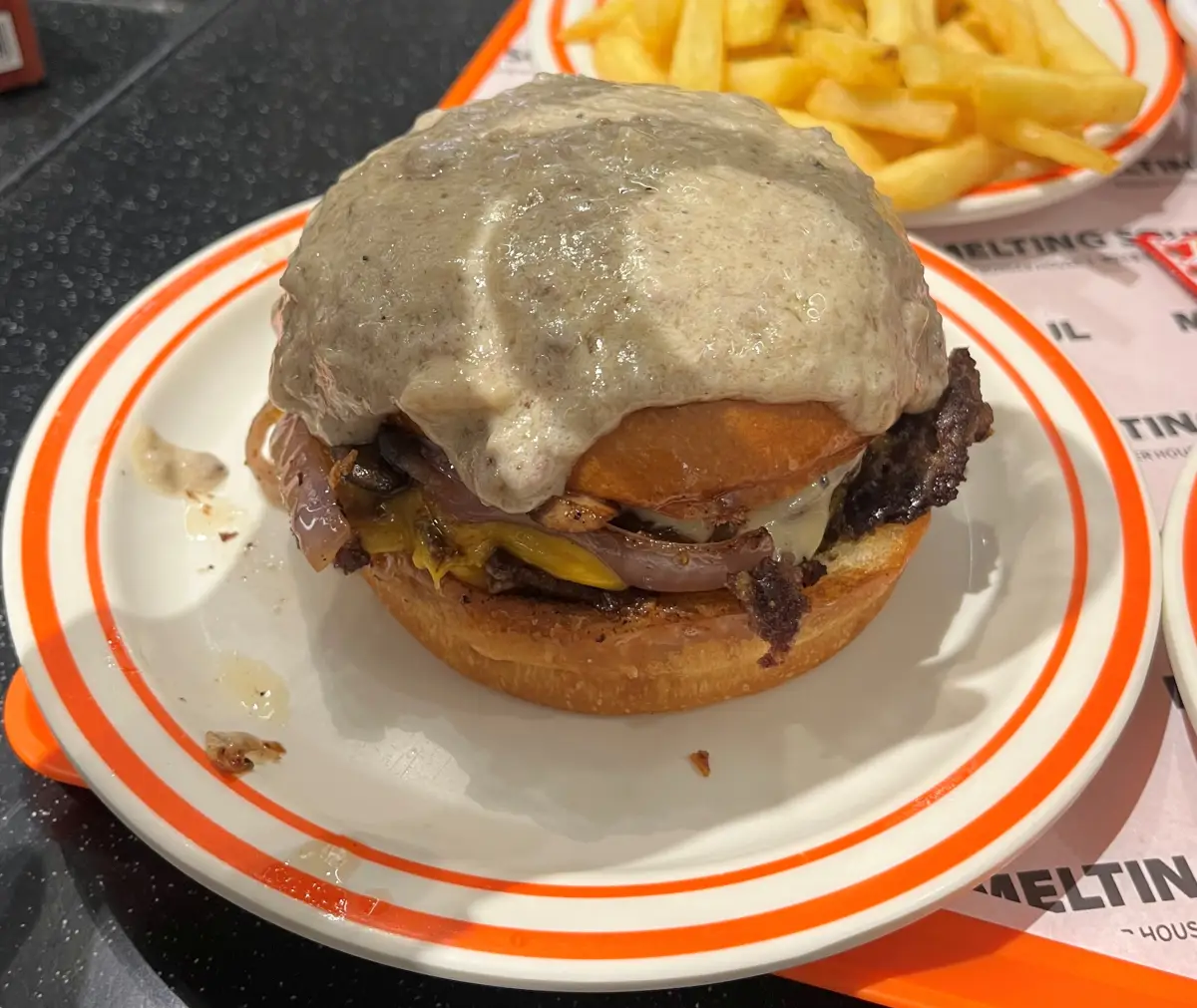 저 소스가 담긴 컵을 위로 올리면 바로 버거 위를 덮어 버립니다. 저는 느끼한 걸 좋아하지만 참고로 안 좋아하시는 분들은 멜팅이 아닌 메뉴를 추천드릴게요. ㅋㅋㅋ저는 이 화이트라구 소스의 이 크리미함이 너무 좋더라고요. 전 파스타도 크림파스타를 제일 좋아하거든요.. 약간 '크림파스타 느낌의 버거'라고 보시면 될 듯해요. 우선 고기도 너무 잘 구워주셔서 고기랑 크림이랑 같이 먹는 느낌이 너무 맛있었습니다.