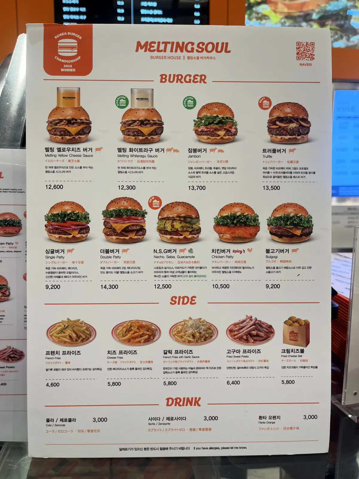 '멜팅 소울'의 메뉴입니다. 보시면 멜팅 소울의 시그니처 같은 멜팅 버거들이 있어요. 저는 항상 어딜 가든 시그니처를 좋아합니다. ㅋㅋㅋ 아 그리고 기본 버거로 보이는 싱글 버거나 더블버거도 맛있어 보이네요. 기본적으로 버거 메뉴 밑에 들어간 재료나 소스 등 간략한 설명이 쓰여있으니 보고 참고하시기 좋을 듯해요.