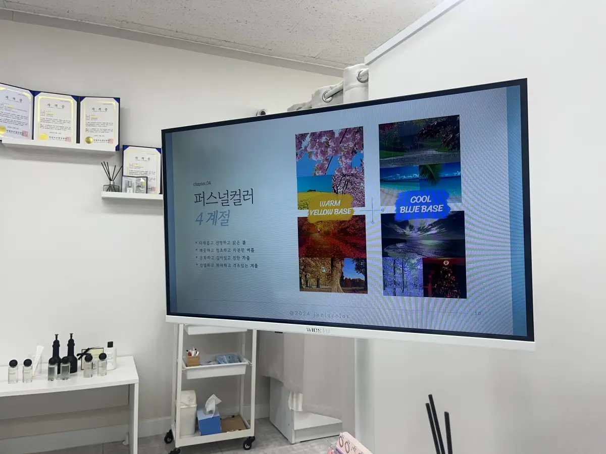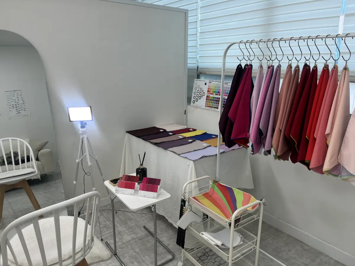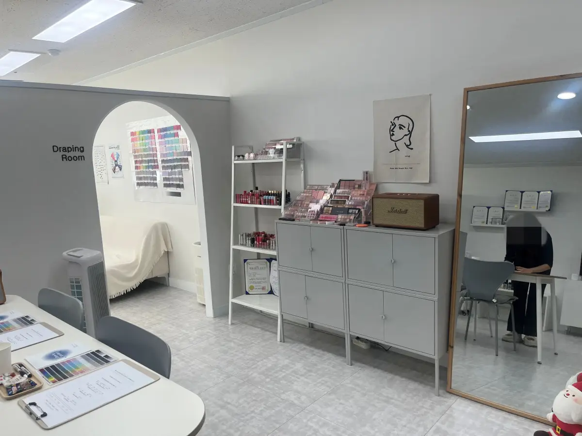 내부는 퍼스널컬러 진단하는 곳답게 아주 컬러가 여기저기 많았어요. ㅋㅋㅋ그리고 화장품도 많이 진열되어 있더라고요. 그리고 사장님 2분 중 1분이 먼저 저희를 안내해 주십니다. 내부는 진짜 깔끔하고 프라이빗해서 너무 좋았어요.