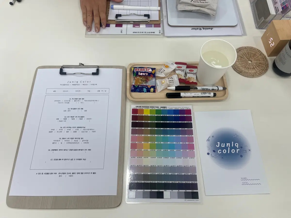 먼저 설문조사 같은 것을 진행해서 평소 내가 퍼스널 컬러가 뭐라고 생각하는지, 추구하는 이미지는 무엇인지 이런 것들에 대해 같이 얘기를 나눕니다. 그리고 대략적으로 퍼스널 컬러들이 어떤 것들이 있고 어떤 분위기를 가지고 있는지 설명해 주세요. 사장님이 너무 재밌고 친근하게 설명해 주셔서 화기애애하고 편하게 얘기 나눌 수 있었습니다. ㅎㅎㅎ