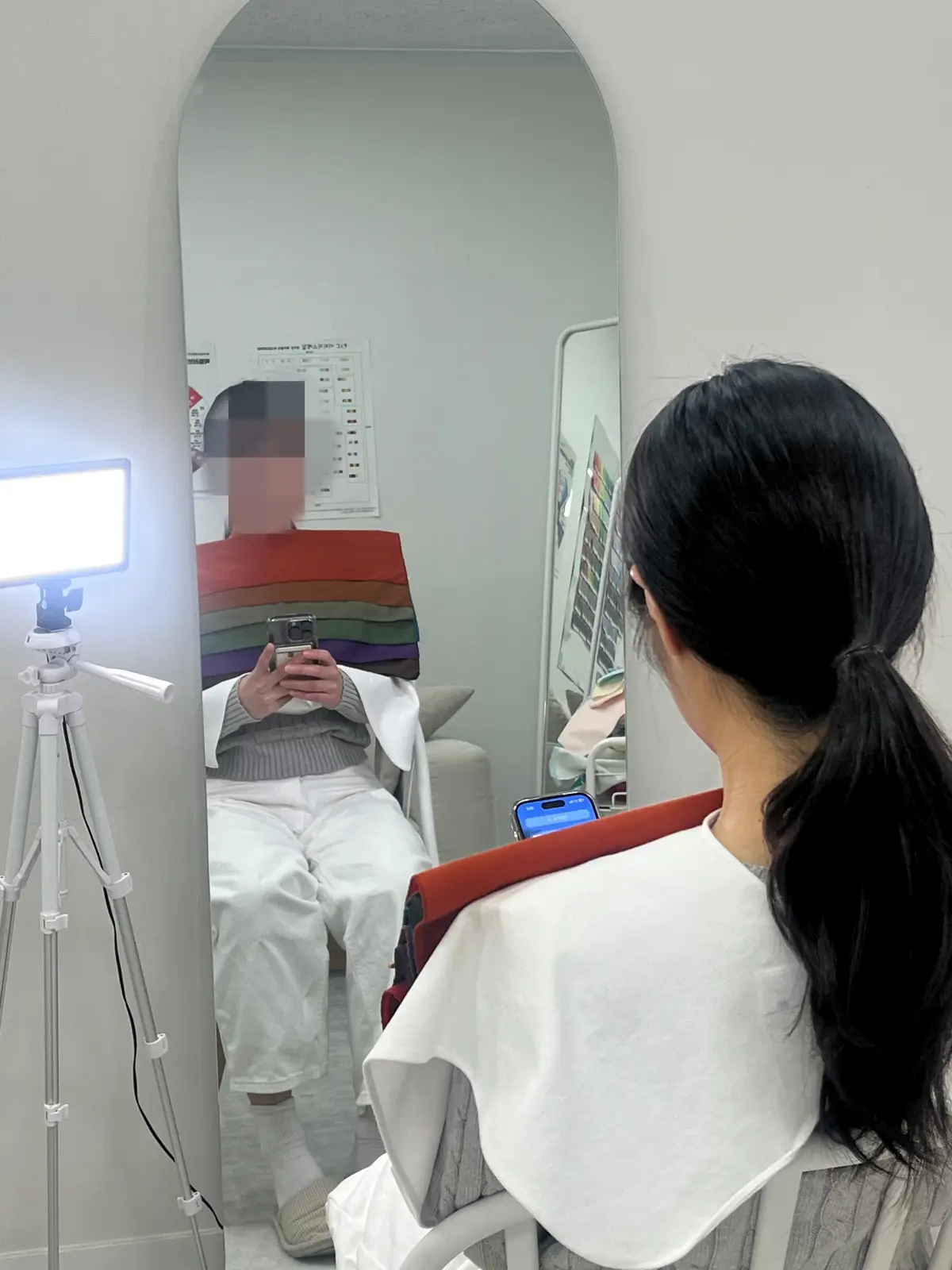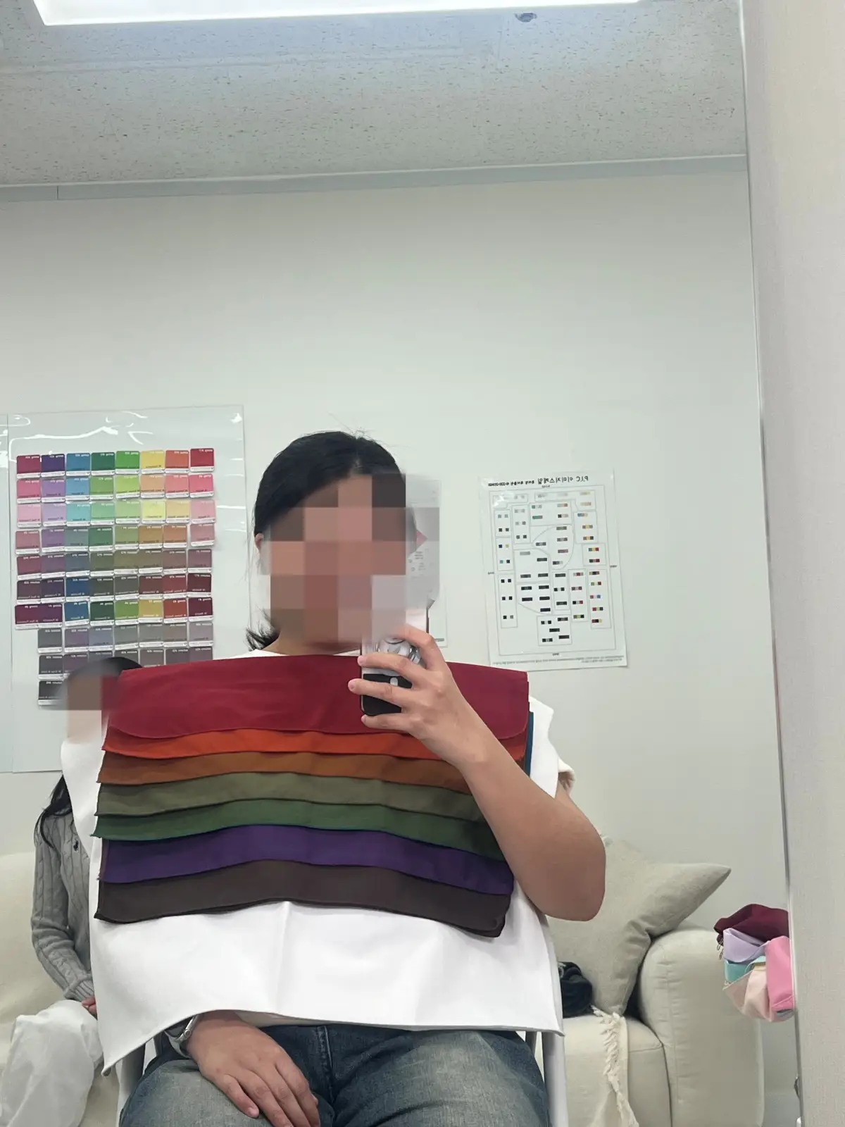 확실히 조명이 저를 딱 비춰주고 있는 가운데 색 천들을 얼굴에 대보니깐 얼굴 톤에 맞는 색이 조금은 보이더라고요. ㅋㅋㅋ확실한 건 안 어울리는 건 진짜 잘 보여요... ㅋㅋㅋ누가 봐도 이건 아니다 싶은..ㅎ..