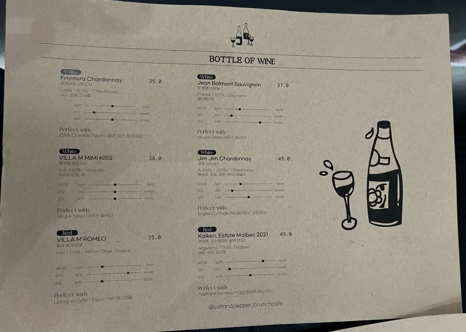 먼저 오늘 와인과 함께 점심을 즐길 생각으로 와서 와인 메뉴판도 같이 봤어요! 와인을 잘 알지는 못해서 고르기 어려울 듯했는데, 바디감이나, 산도, 당도가 같이 표시되어 있어 결정하기 좋아요. 저랑 친구는 먼저 화이트를 먹기로 결정을 하고 적당한 도수의 와인으로 골랐답니다 ㅎㅎ 고른 와인은 아래에서 설명드릴게요.