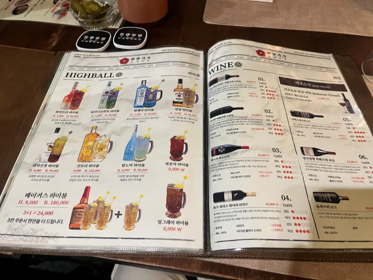 화양가옥은 식사와 술자리를 다 함께 할 수 있어서 좋은 것 같아요. 그래서 가볍게 한잔 하면서도 맛있는 양식 같이 먹기 너무 좋아요. 그리고 세트 메뉴도 있기 때문에 그것도 고려해 보시면 좋을 거 같습니다.