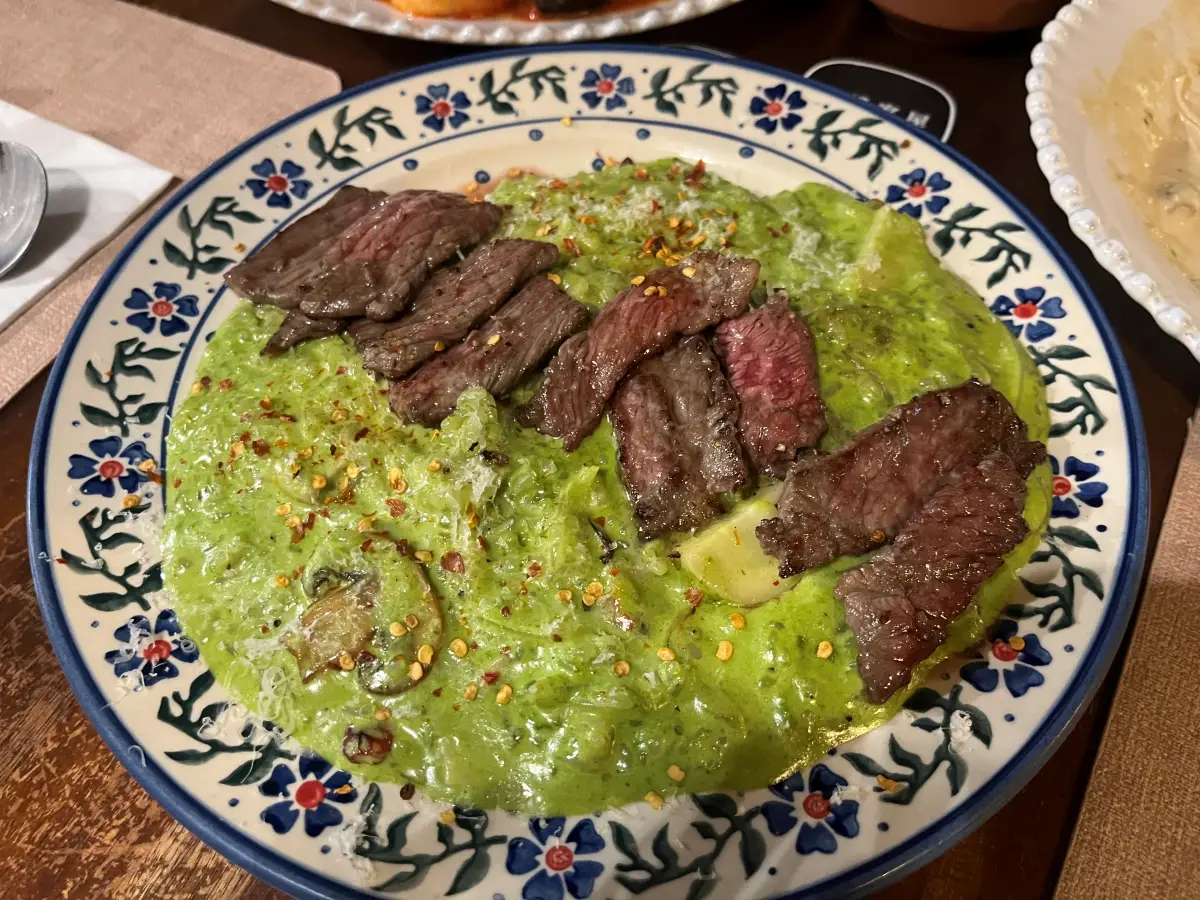 먼저 초록초록한 조금은 특이한 비주얼로 보이는 '비프칠리 리조또'를 소개해드리자면, 먼저 위에 올라간 소고기가 너무 맛있어요. ㅋㅋㅋ이거 먹고 스테이크 시켰어야 되나 여기 스테이크 잘하네.. 생각했습니다. 리조또는 초록색이 무슨 소스인지 궁금했는데 맛은 크림맛인데 매콤한 맛이 나는 소스였어요. 약간 스파이시하다고 생각하시면 됩니다.