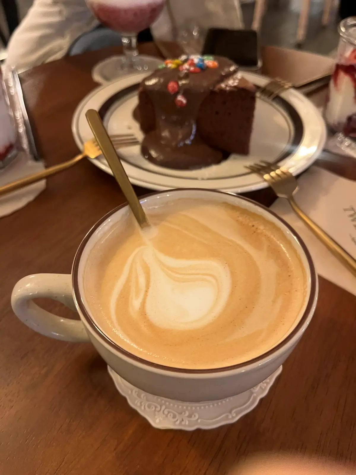 그리고 크림초코케이크 크게 한번 보여드릴게요.. 진짜 꾸덕한 초코 크림이 올라가 있고 M&M 초콜릿 같은 거를 올려주시더라고요. 진짜 달아요..그거 아시나요? 단 디저트 먹을 때는 원래 안 단 커피 마셔야 양심에 덜 찔린다는 것을...ㅋㅋㅋ그래서 저는 카페라떼 시킨 거로 안심했습니다.