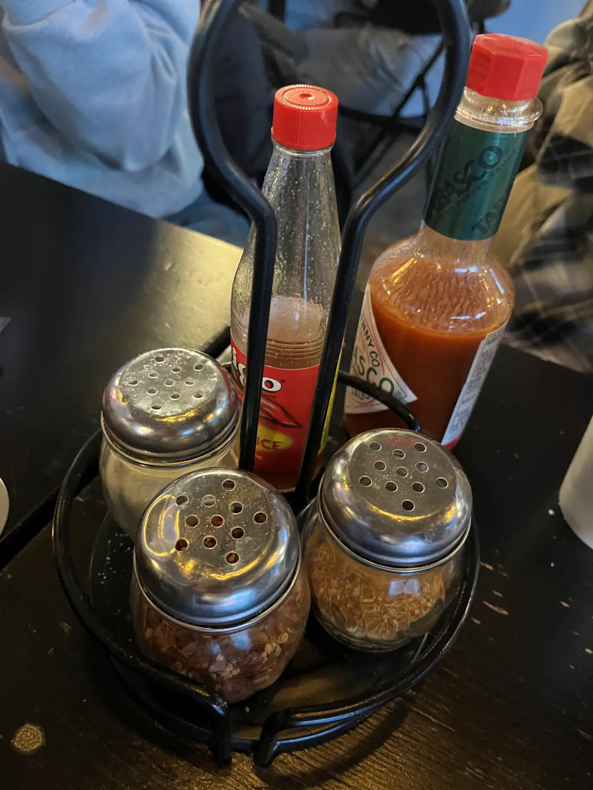 그리고 자리마다 소스들이 있는데요. 다른데 가면 핫소스랑 파마산치즈만 주잖아요? 여기는 진짜 찐인 게.. 갈릭후레이크랑 레드페퍼가 있습니다. 이거 진짜 북미권에서 피자집 가면 다 있는 건데.. 한국에서 느끼는 미국 피자맛👍