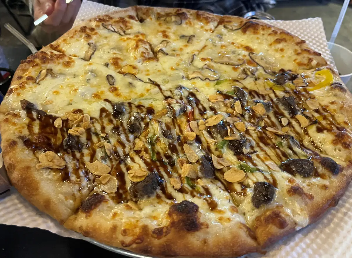 마지막으로 스테이크가 가득 올라가 있는 '존스테이크피자'입니다. 진짜 스테이크 아낌없이 넣어주신 거 보이시나요. 마늘 후레이크도 같이 씹을 때 진짜 잘 시켰다고 생각이 들었습니다.