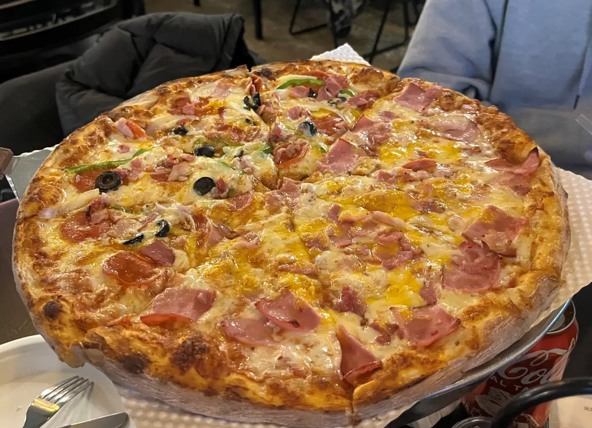 다음 햄이 많이 보이고 체다치즈가 같이 보이는 피자가 '존앤진피자'에요! 이것도 사실 근본입니다. 존앤진이라는 이름을 달고 있다는 거부터 시그니처라고 보시면 될 거 같아요. ㅋㅋ 확실히 치즈 모짜렐라치즈랑 체다치즈가 같이 들어가서 그런지 더 풍성한 맛이 느껴졌어요. 그리고 야채는 별로 없고 햄 가득 ㅋㅋㅋ 짭조름한 미국 피자 맛입니다.