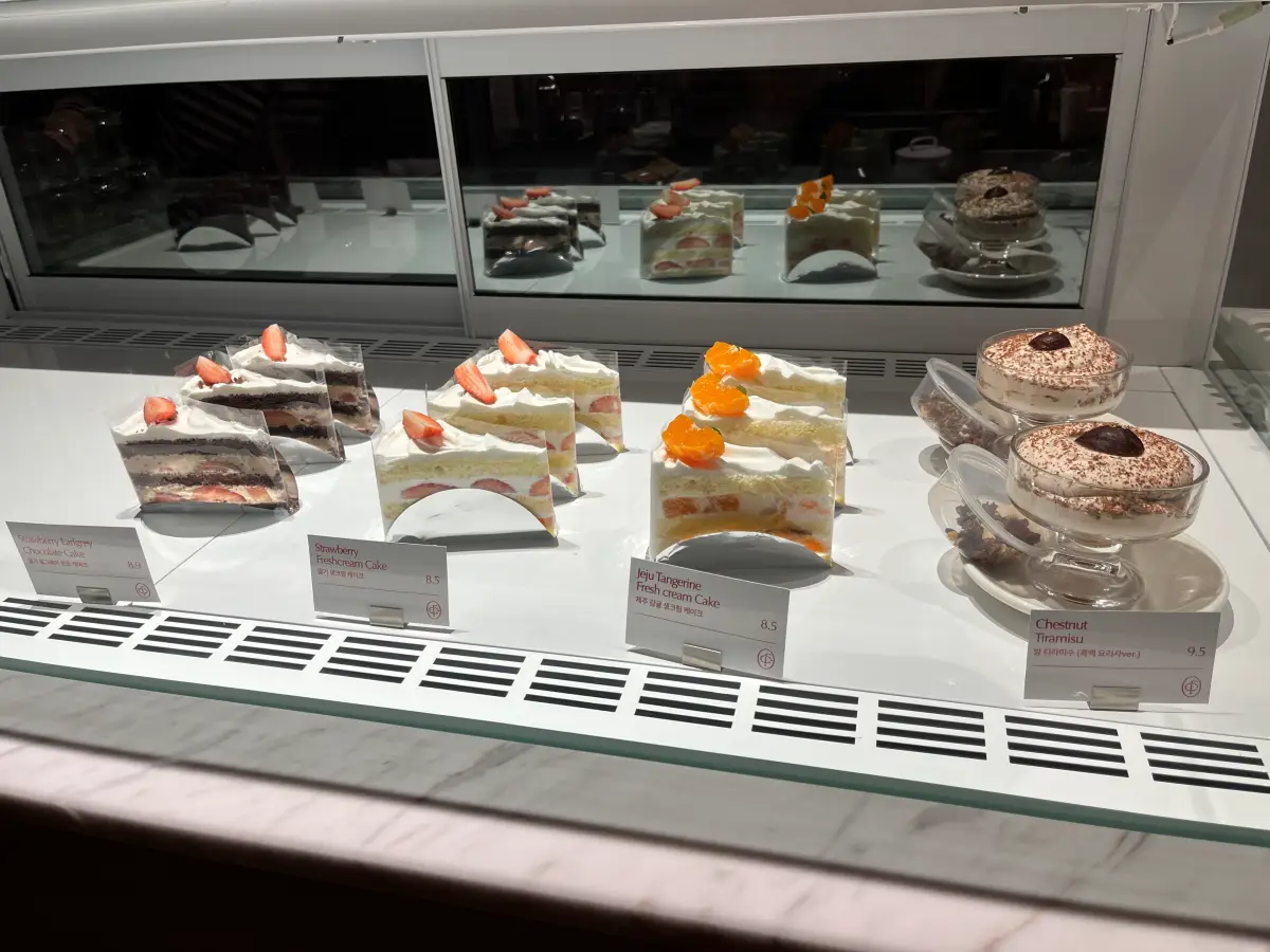 저는 혼자 갔기 때문에 커피 한잔이랑 디저트 하나를 시킬 생각이었어요! 제가 갔을 때는 케이크 종류가 4가지가 있었어요! 비쥬얼적으로 다 너무 맛있어보였는데, 개인적으로는 얼그레이를 좋아하기 때문에 딸기 얼그레이 초코 케이크를 시켰어요. 마지막까지 밤 티라미수랑 고민하긴 했답니다... (나중에 리뷰들을 찾아보고 알았는데 케이크 종류는 시즌에 따라 다른 것 같아요!)