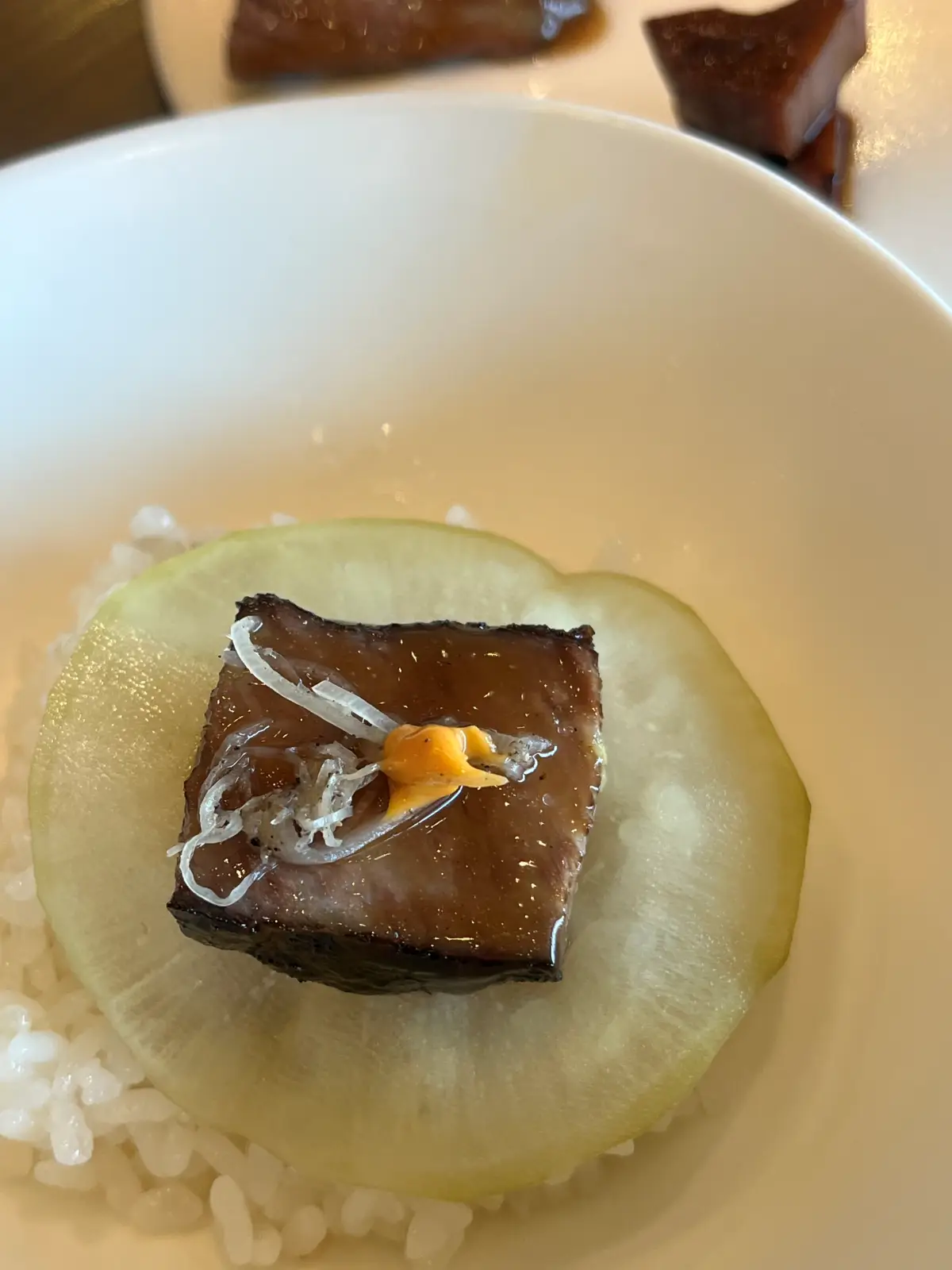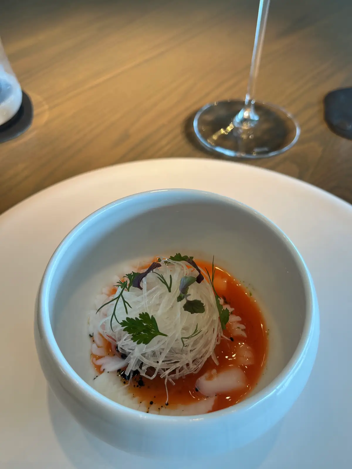 콜드 푸드가 나왔는데요. 오징어 물회라고 표현하는 게 맞을지는 모르겠지만 ㅋㅋ 정말 부드러운 오징어를 저 빨간 국물 같은 거랑 먹는데 약간 진짜 한국의 오징어 물회가 생각났어요. ㅋㅋ매운맛은 전혀 없는데 뭔가 상큼 새콤하면서 맛있더라고요.