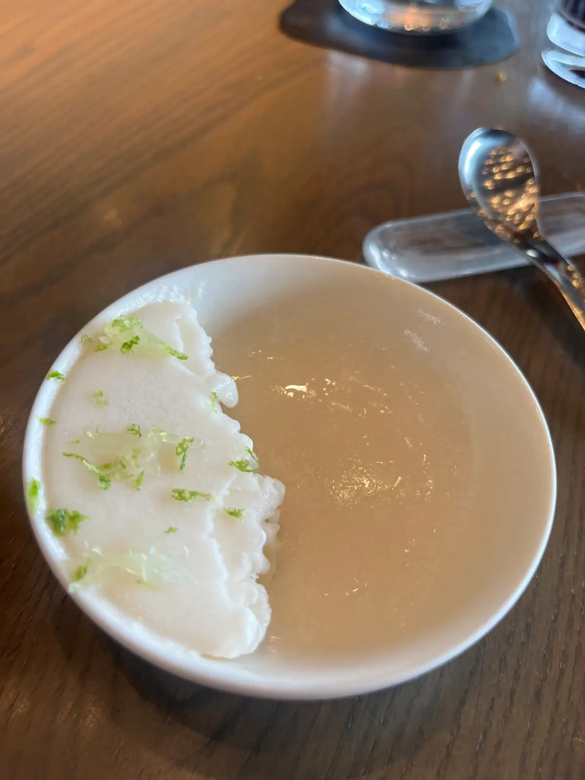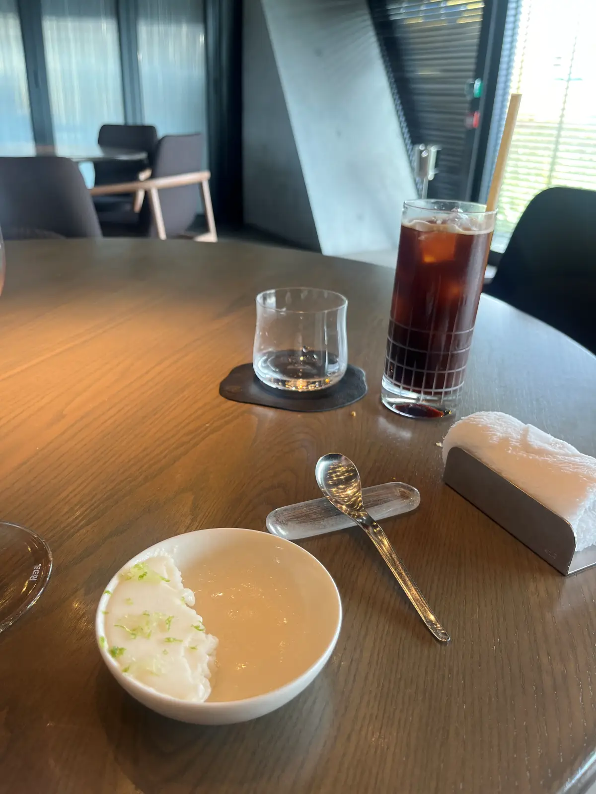 아니 벌써 마지막 디저트 타임입니다... 너무 아쉬웠어요.. 벌써 끝이라니.. 근데 벌써 2시간이 지나있더라고요.. 주위에 테이블이 다 비워지고 저희밖에 없더라고요.. ㅋㅋㅋ 먼저 디저트와 함께하는 음료로 티나 커피 중에 물으셔서 아이스커피를 달라고 부탁드렸습니다. 그리고 첫 번째 디저트는 '자스민 샤벳'입니다. 진짜 부드럽고 상큼한데 향도 좋고 마무리로 너무 좋았습니다.