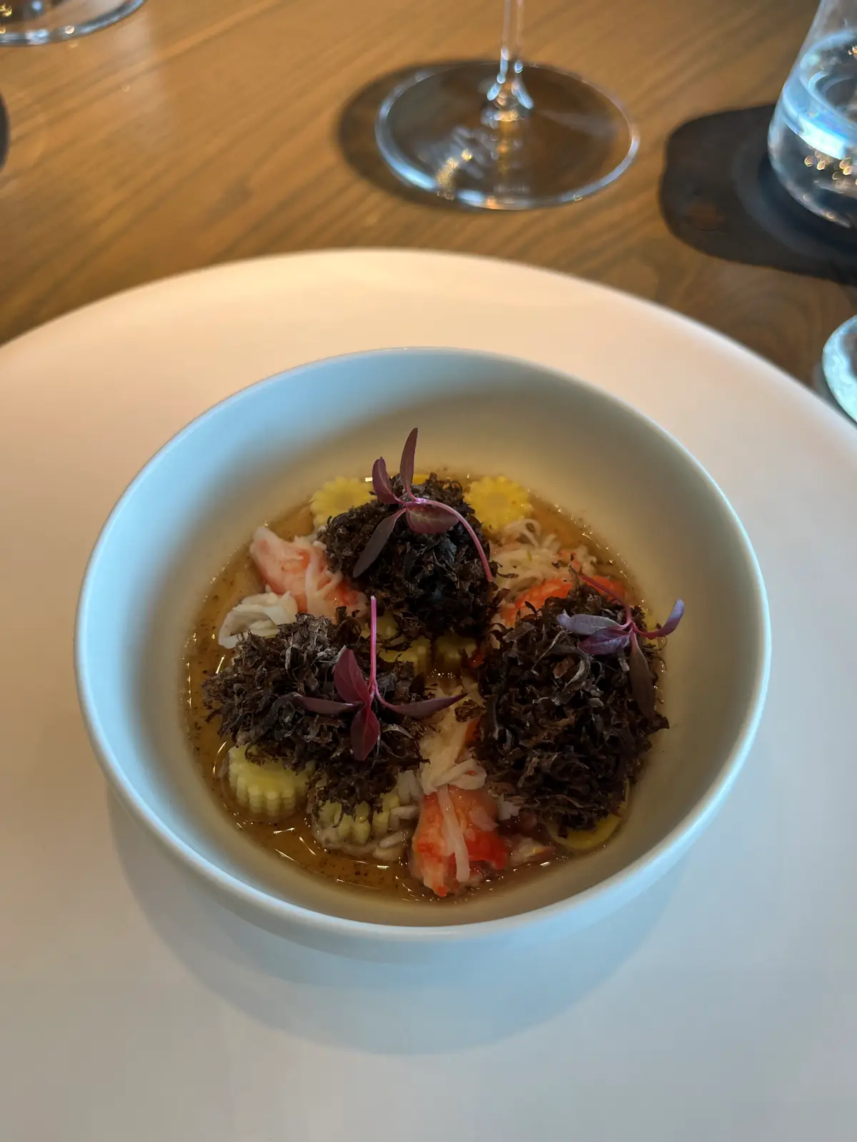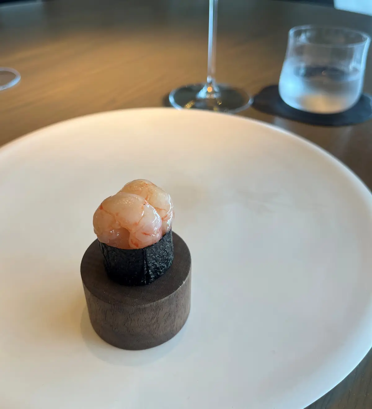 첫 번째로 나온 작은 한입은 '감태단 새우'입니다. 저희가 좀 안 먹고 사진 찍고 있었는데 소믈리에님께서 작은 한입은 나왔을 때 바로 먹는 게 제일 맛있다고 말씀해 주셔서 먹었는데.. 와우.. 진짜 맛있었어요. 달달한 새우를 바삭한 감태로 감싸고 있는데 식감도 재미있고 첫 입부터 감동이었습니다.