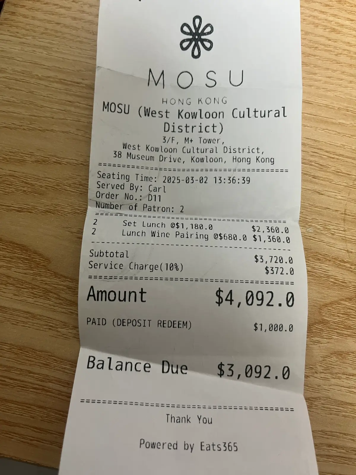 가격입니다!! 💰 런치 1인당 HKD 1,180 + 와인 페어링 1인당 HKD 680 + 서비스 차지 10% = 1인당 HKD 2046 (환율 180원 기준 368,280원)입니다. 마지막 계산에서 예약금으로 1인당 HKD 500을 내서 그거 빼고 현금으로 결제하고 왔네요.