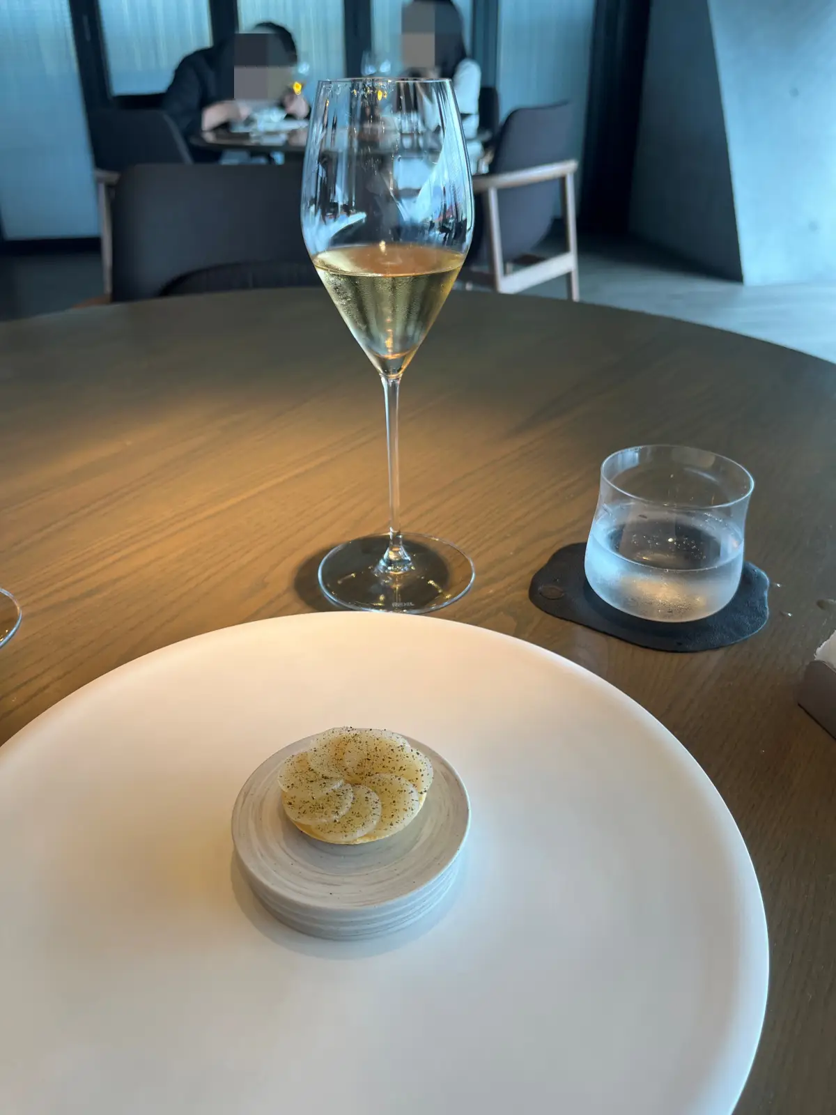 먼저 웰컴 드링크를 주시는데 상큼했습니다. 한잔 꿀떡했는데 과일 맛이 달달하게 나서 산뜻하게 마셨습니다. 그리고 첫 번째 와인 페어링으로 스파클링 와인을 주셨습니다. 소믈리에 분이 한국분이셨는데, 육식맨 유튜브에 나오셨더라고요. 괜히 반가운 기분... 엄청 친절하시고 와인 설명도 재미있게 해주십니다. ㅎㅎ 그리고 한국말로 음식 설명도 같이 해주셔서 너무 좋았습니다. 진짜 친절하세요.