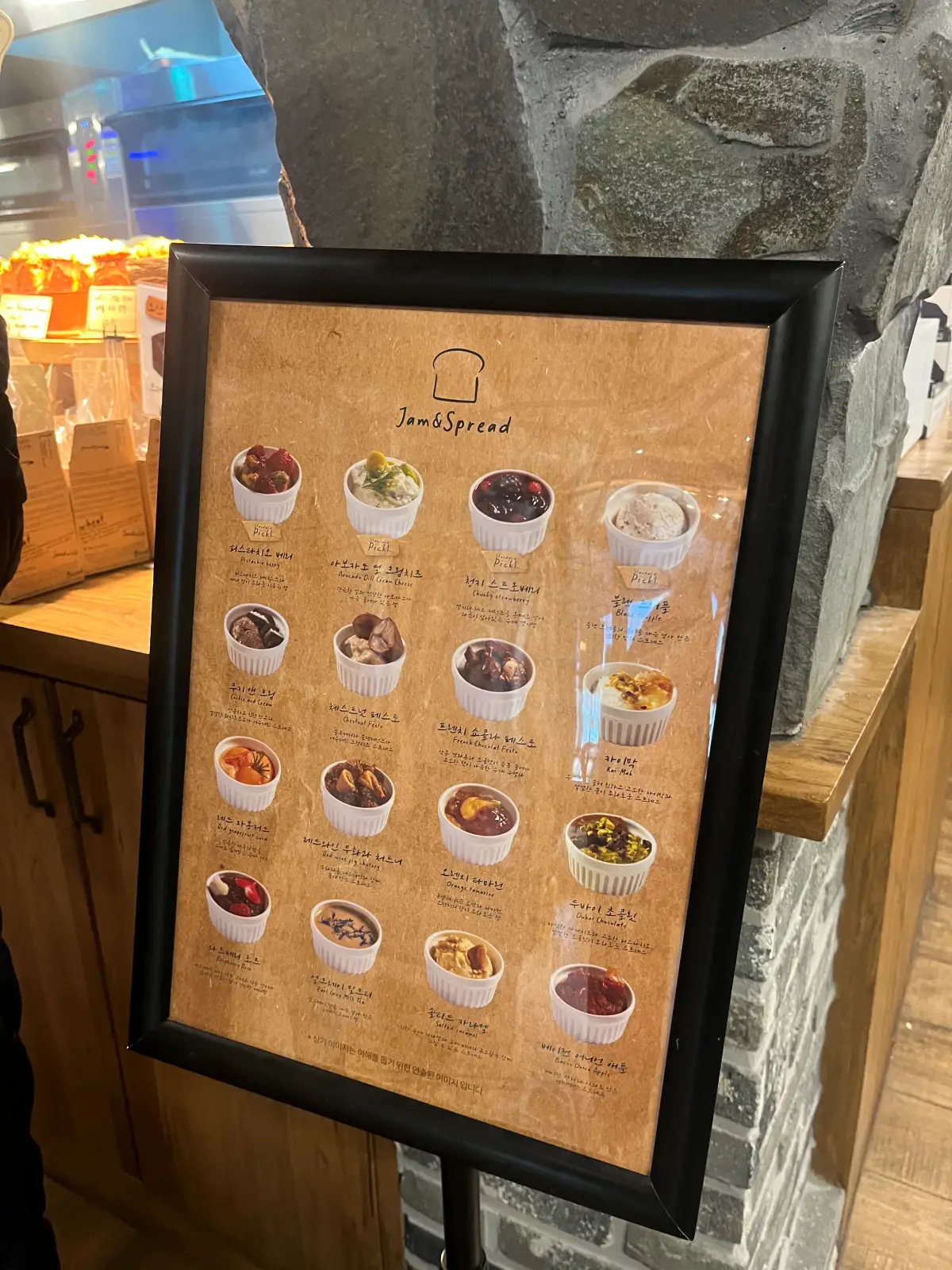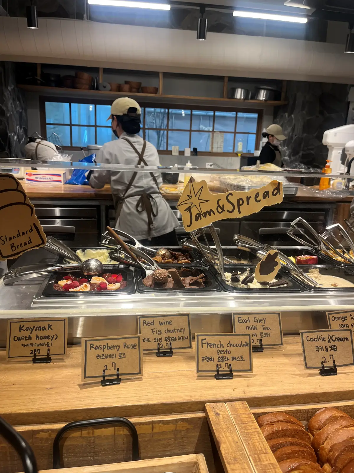 가장 시그니처는 '솔티드버터 생식빵'인 거 같아서 우선 그거 하나 골랐습니다. 1/2 사이즈 짜리로 보시는 크기예요! 가격은 5,000원 정도입니다. 물론 그냥 일반 베이커리집에서 파는 식빵보다는 비싼 편입니다. 빵을 골랐으면 바로 옆에서 같이 먹을 잼&스프레드를 고르러 이동하시면 됩니다.