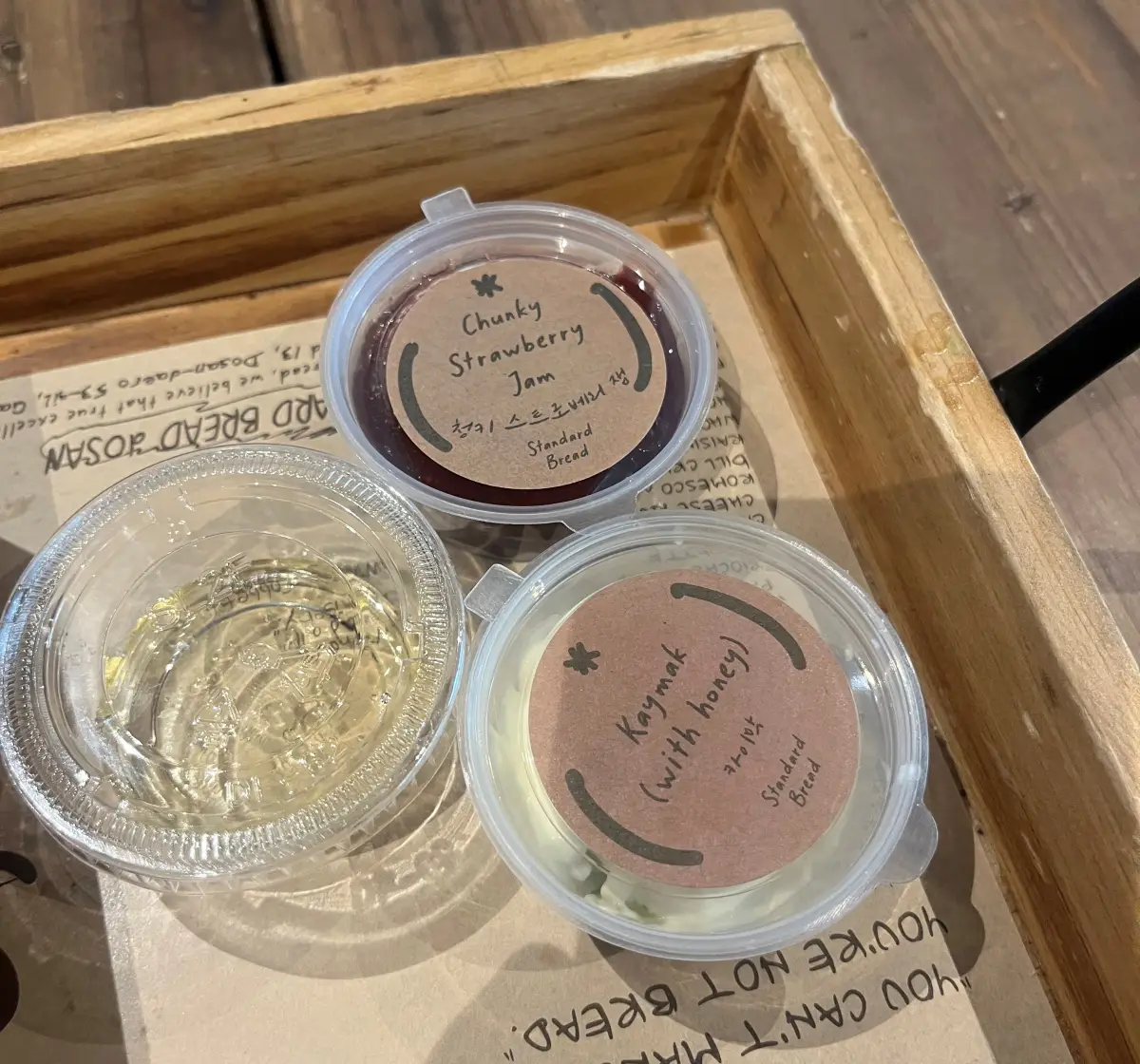 솔티드 버터 생식빵과 청키스트로베리 잼, 카이막 그리고 꿀입니다! 카이막을 시키니 꿀도 같이 주시더라고요! 역시 역시 카이막은 꿀과 함께죠! 카운터에서 잊지 말고 받아 가세요. 아 진짜 따뜻한 식빵을 보니 빨리 먹고 싶다는 생각 밖에 안 들었습니다.
